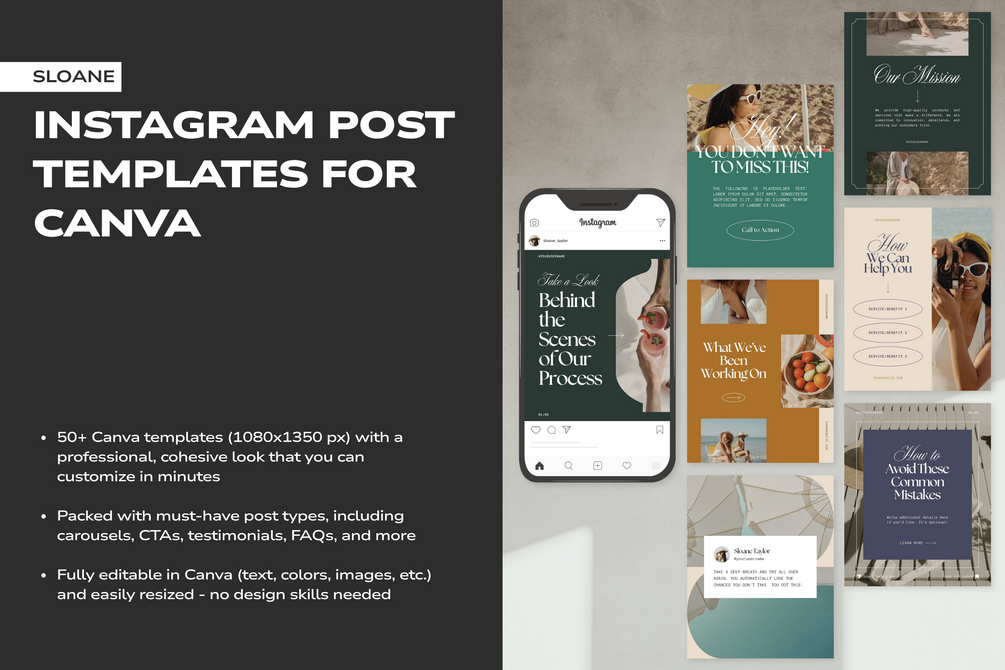 • A PDF with a direct link to 50+ Instagram post templates for Canva (1080x1350 px)